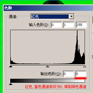 上图中选择使用绿色通道(此图该通道对比度较高),因此将红色、蓝色通道的输出色阶最高值设置为0。