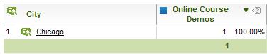 Conversion Variables have a direct relationship to Success Events. I like to think of the two as “married” since they complement each other. When a SiteCatalyst Success Event takes place (i.e. visitor takes an action that results in a Success Event being set), SiteCatalyst assigns credit for the Success Event to one value in each Conversion Variable report (please re-read that once or twice!). For example, if an Online Course Demo Success Event takes place, whatever value is currently stored for that visitor for Conversion Variable 1 gets credit for that Success Event. Whatever value is currently stored for that visitor for Conversion Variable 2 gets the credit for that Success Event and so on until all Conversion Variable values are incremented. So let’s imagine you have a website with only one visitor, where Conversion Variable 1 is used to capture City and we have used custom tagging to capture the fact that this visitor is from the city of Chicago. If that one visitor subsequently launches an Online Course Demo and a Success Event takes place, the Online Course Demo Success Event report would show a total of “1″ and the Conversion Variable 1 (City) report would show a value of “1″ for the “Chicago” row (assuming that the Conversion Variable 1 report was showing the Online Course Demos metric) as shown in this sample report: