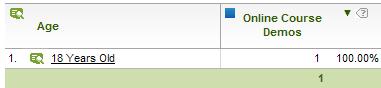 As many more Success Events take place, different Conversion Variable values (Cities in this example) would get credit for the various Online Course Demos that take place on the site such that, over time, the report would have many cities and the associated number of Online Course Demos that took place for each. But, if Conversion Variable 2 represented the current visitor’s Age, then at the same time each City is getting credit for each Online Course Demo in Conversion Variable 1, a specific Age value (say “18 Years Old”) is getting credit for the same Success Event in the Conversion Variable 2 report which would look like this:
