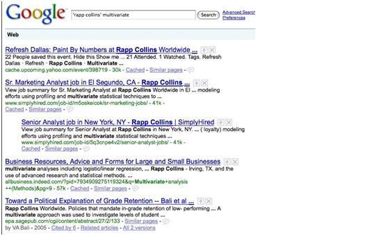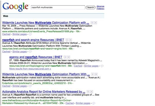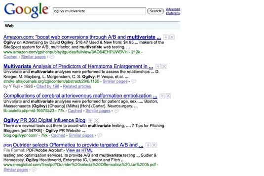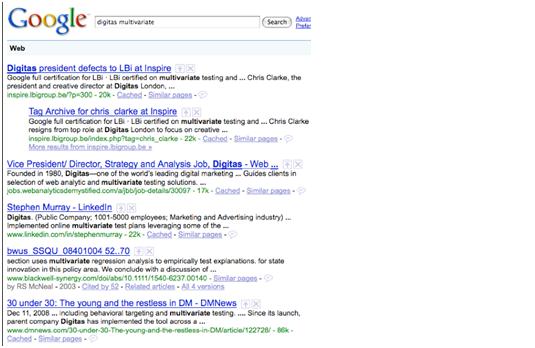 Aside from the handful of agencies that specialize in testing and conversion optimization, I’ve seen far less progress than I expected this year. To do a sanity check, I googled “[agency name] multivariate” on the top 4 digital agencies of 2007 from AdAge. Here’s what I found: