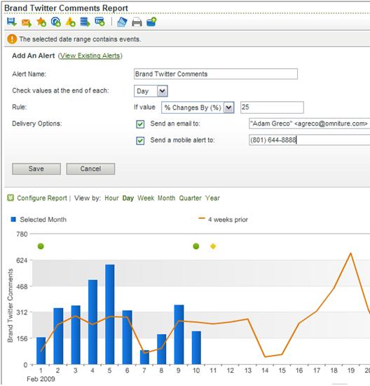 As stated earlier, the key to this solution is leveraging the SiteCatalyst Data Insertion API and the Twitter API. For those of you not familiar with the SiteCatalyst Data Insertion API, it is used to send data to SiteCatalyst when a JavaScript tag is not an option. By combining this with the search.twitter.com API, we can set a SiteCatalyst Success Event for every “Brand Tweet” by pumping the results of a “Comcast” Twitter search into SiteCatalyst. This allows us to see a metric chart of “Brand Twitter Comments” so we can track it by month, week, day or hour. However, why stop there? SiteCatalyst has a built-in Alert feature that allows you to be notified via e-mail or mobile device when a Success Event metric hits a threshold or changes more than a specified percentage. Why not take advantage of this feature and send yourself (or others) an Alert when your brand is mentioned 25% more this hour than last hour or decreases significantly day to day? This would allow you to stay on top of what is going on in Twitter without having to constantly monitor Twitter every day/hour! Below is a screen shot where you can see the “Brand Twitter Comments” Success Event and an Alert related to it being set: