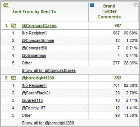- Who are the people most often mentioning Comcast on social media tools and who are they communicating with the most?