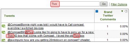 The final thing the CMO tasked us with was discovering when, in addition to our brand name, social media users were mentioning specific keywords that are product or service related. For example, if someone “tweets” about Comcast and in the same tweet mentions “speed” it is likely that this tweet is related to high-speed internet access and could be interesting to the Internet product manager. Alternatively, if a “tweet” mentions Comcast and also mentions “Tivo” or “DVR” it is likely they are expressing an opinion in the digital TV recording arena that would interest the associated product manager. So you have millions of opportunities to read what your customers are saying, but who wants to scan through all of those “tweets” to find the relevant ones, especially if this has to be done manually?