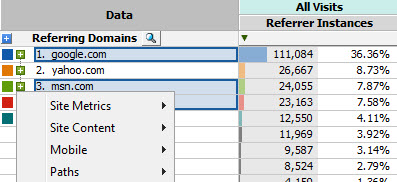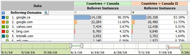 Sometimes my analysis starts with questions like, “Why was there a big jump in visitors from Canada to my website?” This analysis requires me to compare the same segment for two different time periods, which is super easy to do in Discover. Just create your segment and once it is saved you can drag it over to the report twice, so that you have two instances of the same segment in the report. Then at the bottom of the report you will notice you now have two lines on the time range, one for each segment. Use the handles at each of the time line to select the two time periods you want to compare. Because the segments are different sizes I like to look at the percent of total instances each line item represents. As in the screen shot below you may notice that a significantly greater percent of traffic came from one referral source, like in this case “yahoo.com” (5.51% vs. 3.67%).
