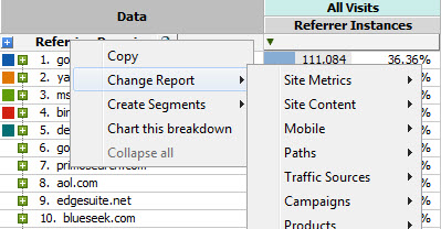 I compare segments, a lot. When comparing segments it takes a little bit of time to get the report set up exactly like I want it with the right segments. Instead of having to go through the same process for all the other reports you want to view you can change a report with the right click of your mouse. Just right click on the report name and go to Change Report and you will see the reports menu. If you want to keep your original report you can copy the report first and then perform this modification on the copy.