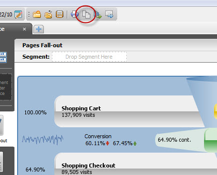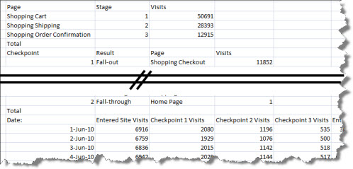 You will notice a lot of data when you paste the fall-out report into Excel. The first section includes the definitions of what each checkpoint is defined as. The second section shows the totals for the top next pages from the checkpoint when visitors fall-out (do not eventually make it to the next checkpoint) or fall-through (continue on to the next checkpoint). The third section is where you will find the trended data for the fall-out, including the percent of traffic that continues on to each step/checkpoint.