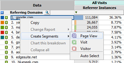 Often I find myself looking at a report in Discover and I think that a particular value in a report is interesting, interesting enough for me to want to dig deeper, which requires me creating a segment. Instead of going to the segment builder from the left menu, you can create the segment from within the report itself. Just right click on the value and you get a menu like the screen shot blow. Once you select which container you want to use, Discover creates the segment and automatically places it in the report that you are in. You can then right click on the segment to save it if you want to keep it for future use.