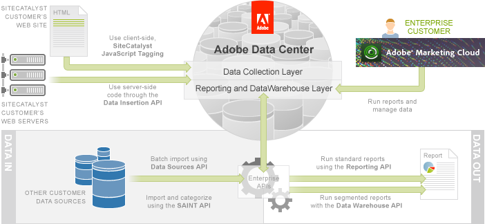 Using the Enterprise API, you can add data to the Adobe Marketing Cloud (Data In) and run reports on this data (Data Out).
