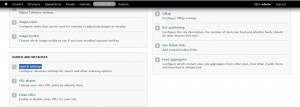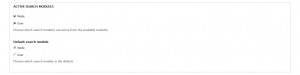 Im ersten Checkboxen legen Sie fest, welchen Inhalts-Typ die Seitenbenutzer suchen dürfen. Setzen Sie den Häkchen neben „Node“, um die Suche den Inhaltselementen zu erlauben. Mit dem Hacken auf „User“ erlauben Sie die Nutzerprofilen zu suchen. (By Default sind die beiden aktiviert) Weil die Suche von Drupal Seite gleichzeitig auf Nodes und Users sitzen kann, werden die Suchergebnisse in zwei Tabs (Content und Users) angezeigt. Mit Default search module (Standard Suchmodul) legen Sie den Standard Tab für die Suchergebnisse fest. Wählen Sie Node (Standard Option), um den Content Tab zuerst erscheinen zu lassen. Wenn die Option User ausgewählt ist, erscheint sich zuerst den Users Tab.