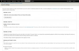 - Indexing throttle (Indexierungsdrosselung) können Sie hier angeben, wie viele Inhalte bei einem Cron-Lauf indexiert werden sollen. Je länger die Breite vom typischen Node, Kommentar oder einen Teil des Inhalts ist, desto mehr Speicherplatz und Ressourcen dazu benötigt wird.