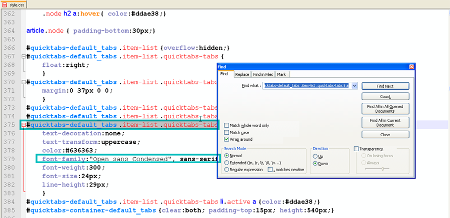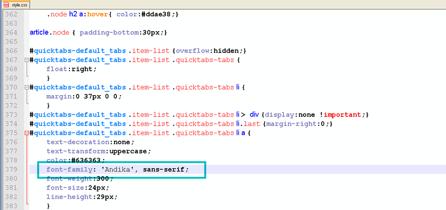 5. Now we need to change the font in .css file. Search appropriate code in style.css file.