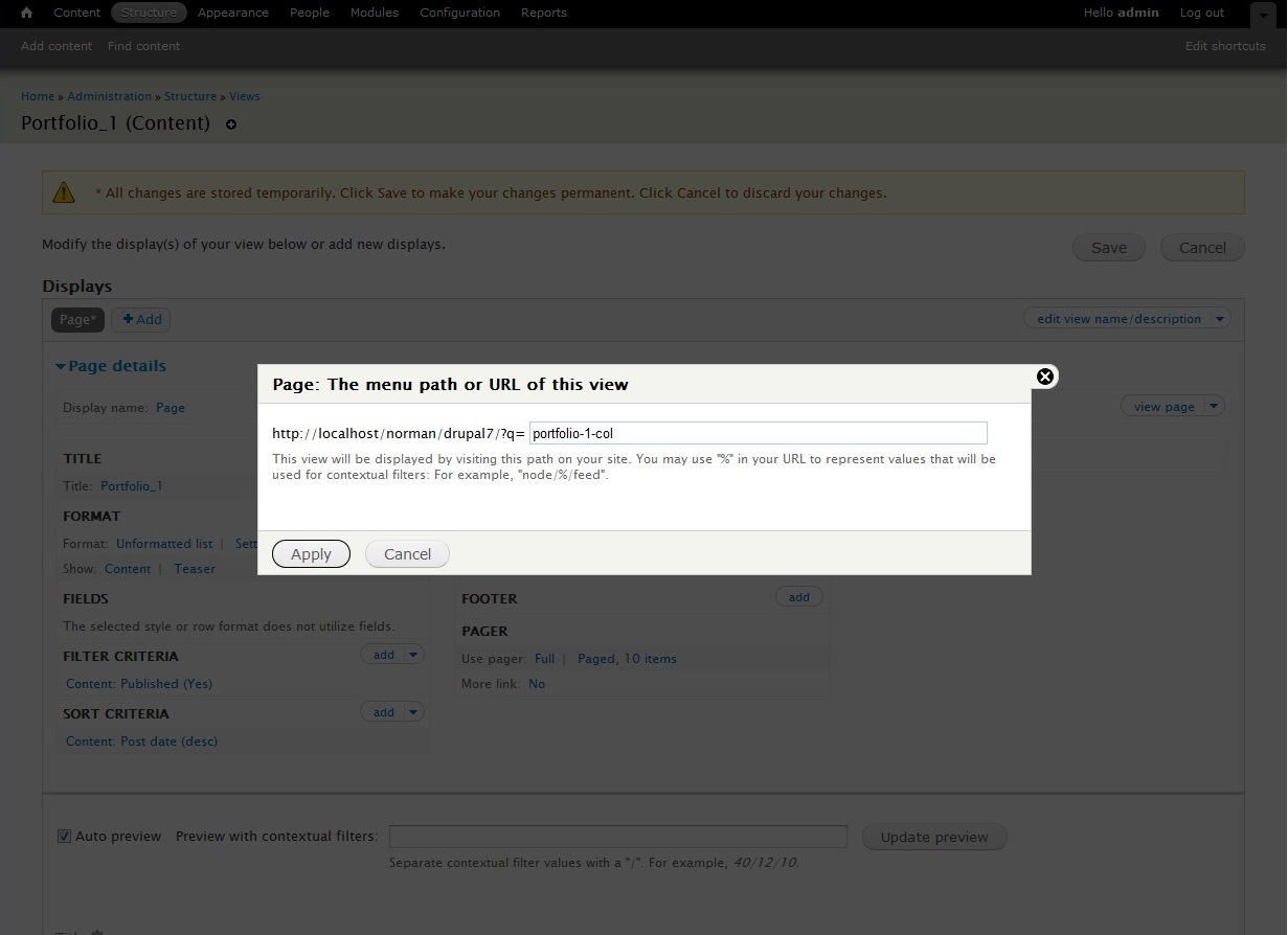 7) Under the "page Settings’ add a new path. The path can be copied from the url of the page (E.g. if your URL is your_site.com/?q=portfolio-1-col , just copy portfolio-1-col);