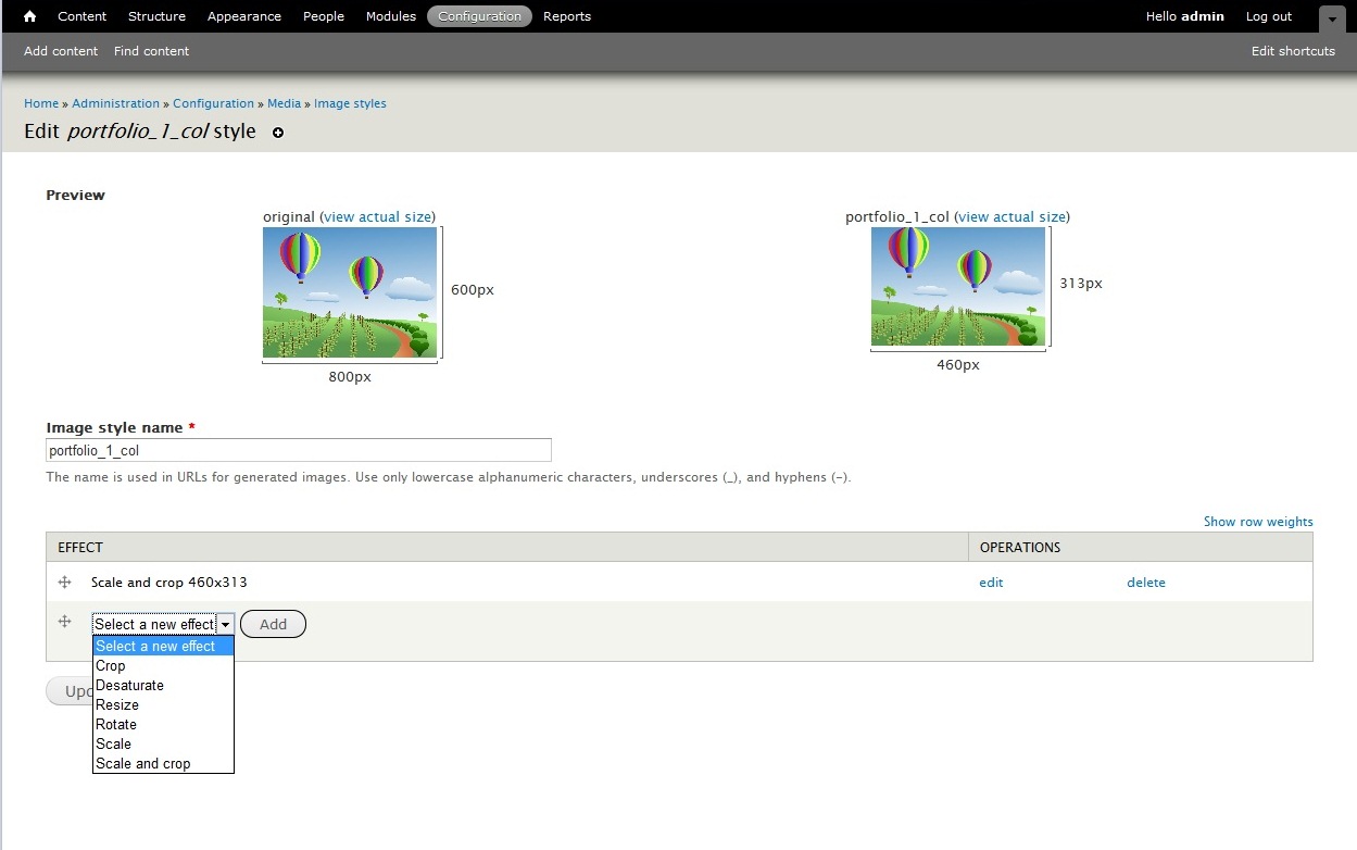 13) If you need to show your portfolio page as a drop-down, drag your new menu to re-order it. To change the galley image sizes on your Portfolio pages, go to the top menu "Configuration" -> ‘Media" -> "Image styles".