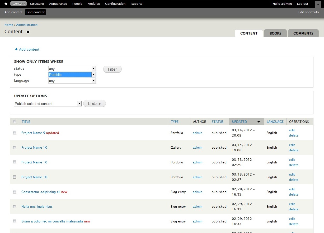 This tutorial is going to show you how to work with a portfolio page on your Drupal template. If your template comes with a custom portfolio page installed with the sample data profile (How to install Drupal sample data), you will get three tabs in the main menu with 3 different gallery layouts.