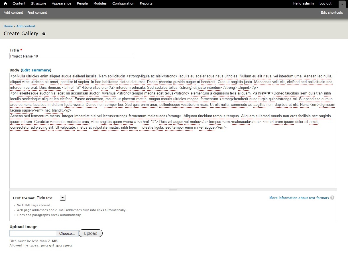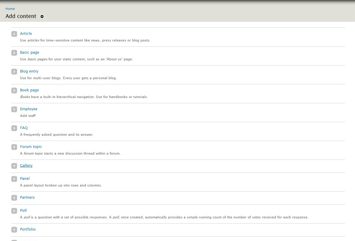 1) In your Drupal administration panel go to Content -> Add Content;