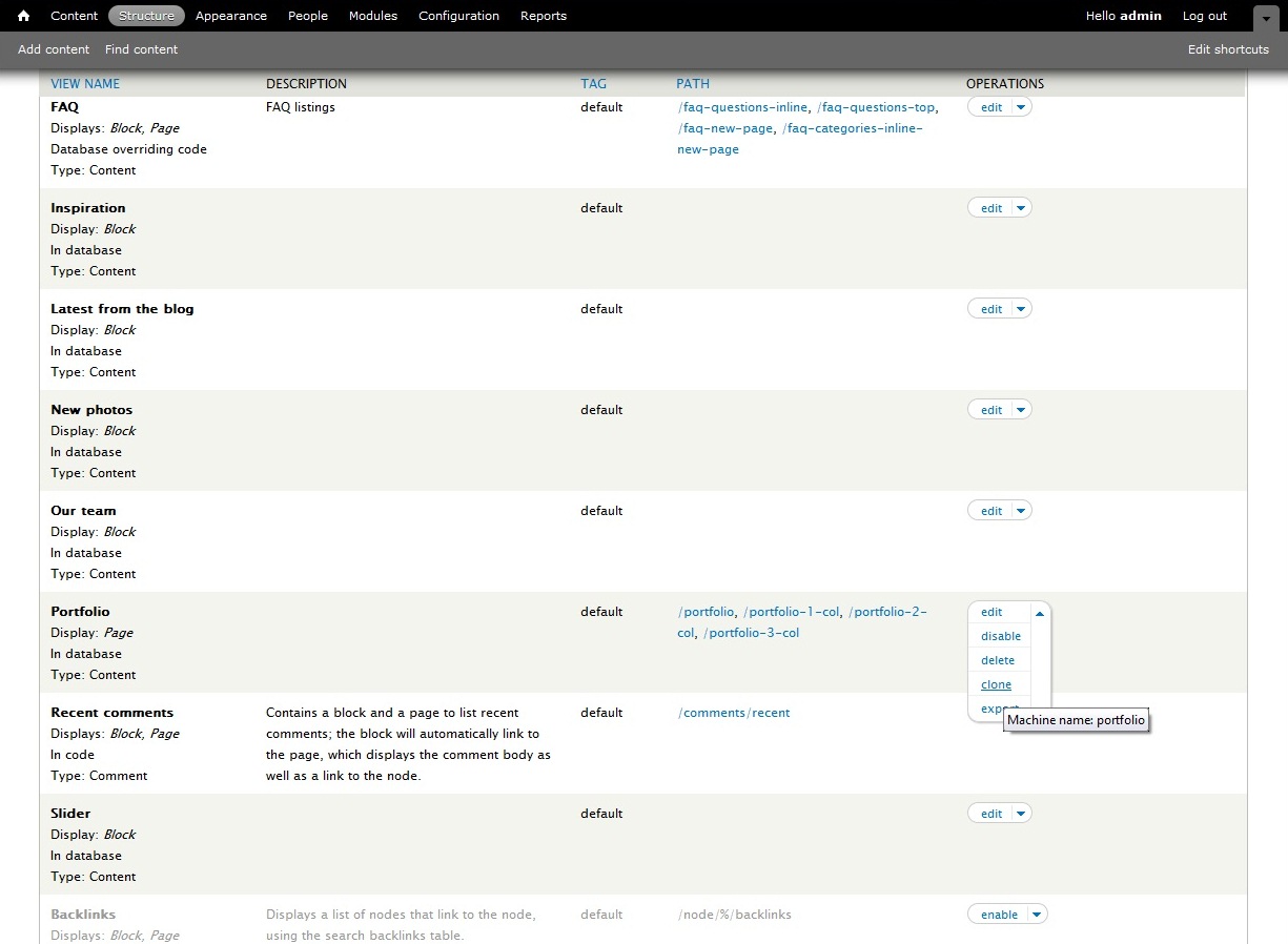2) Under the "Operations" column you can open, edit ( disable, delete, clone or export) the portfolio content view. Select "edit"