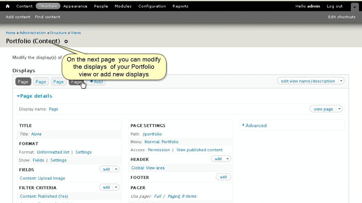 3) On the next page you can modify the displays of your Portfolio view or add new displays. By clicking on different "Page" tabs, you will notice that the only differences between them are the Path and the Menu. To delete any of them, it is enough to delete the menu each one is pointed to