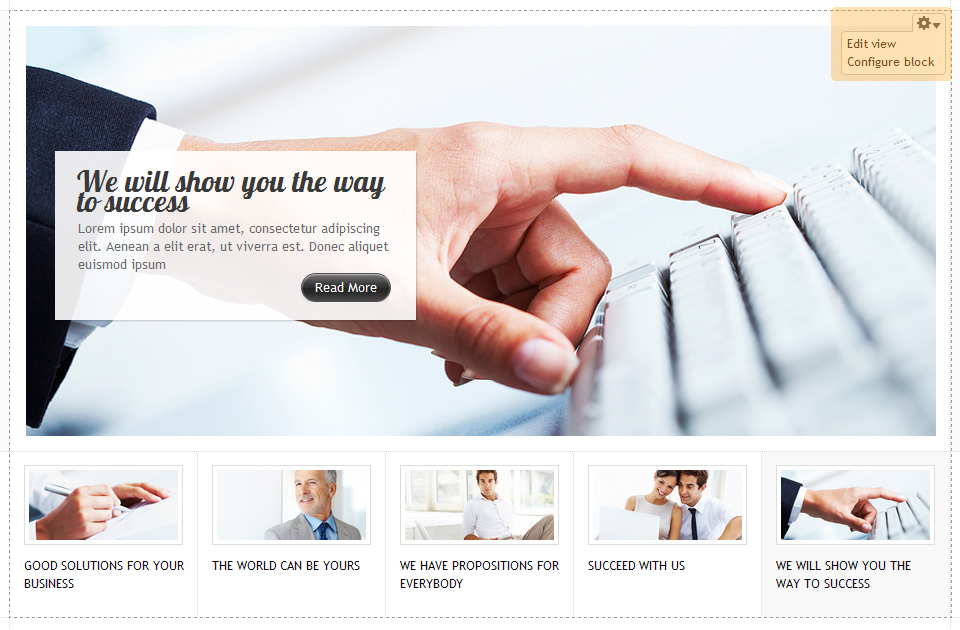 First of all please log in to Drupal as administrator. When logged in please open the website page with slider. Put your mouse cursor over the slider and in the top right corner click at the gear icon.