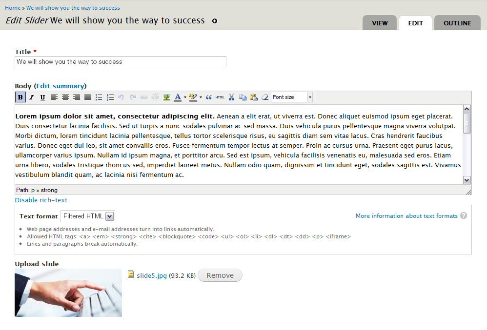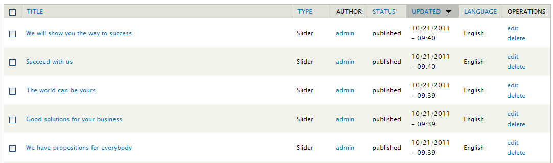 When logged in to Drupal as administrator click Content navigation menu item to see all available content items. To edit slides edit slider content type items.