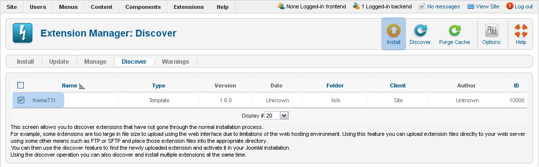 7. Then click Discover button at the top right corner. This will make Joomla find the manually uploaded template folder.