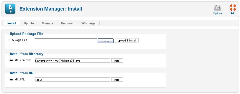 When the download is complete open Joomla admin panel and go to Extensions > Install/ Uninstall (Extensions>Extensions Manager for Joomla 1.6)