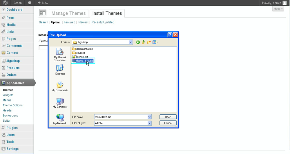 Open Install Themes tab.Install theme zip file. It is called like themeXXXX.zip, where XXXX are actual theme files.Activate the theme after installation.
