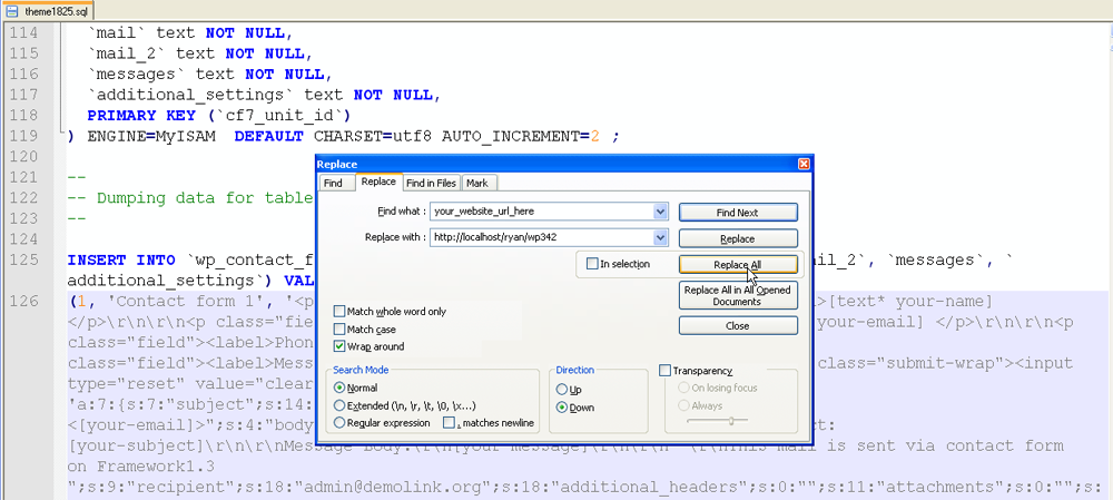 5.2. Go to Search-Find or press CTRL+F. Replace your_website_url_here and with your url (in our case it is http://localhost/ryan/wp342). Save changes.