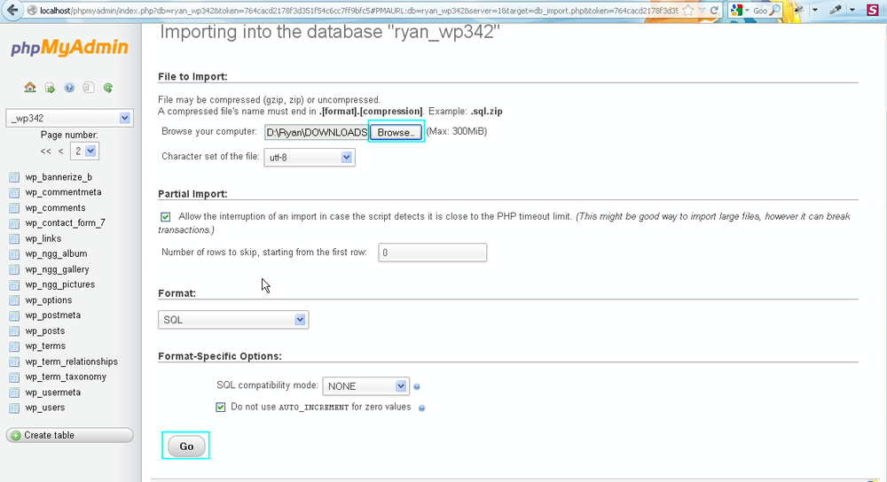 5.3. Now you need to open your database using database management tool. Usually it is called phpmyadmin. Select your database and click on Import tab, select your modified sql file and import it.