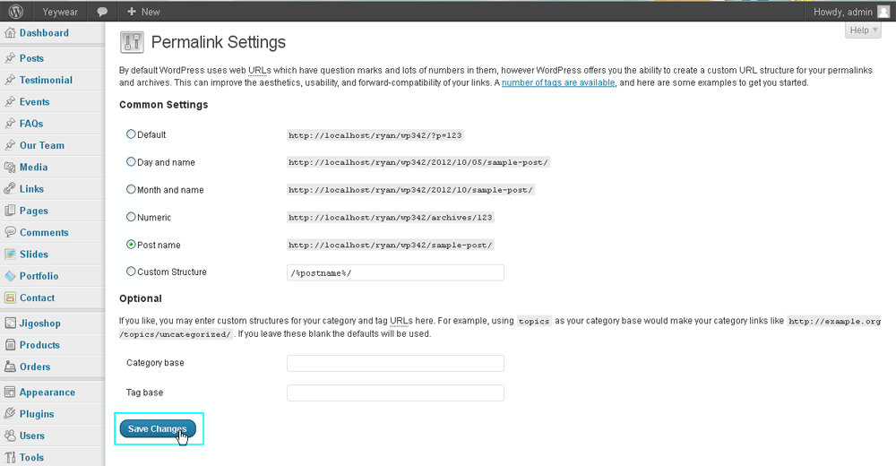 5.4. Open WordPress dashboard after sql file import. Go to Settings->Permalinks.