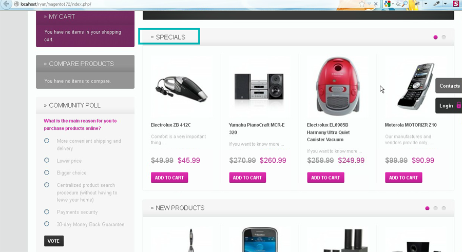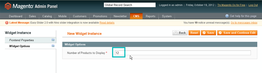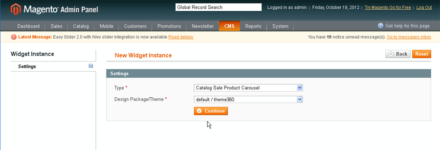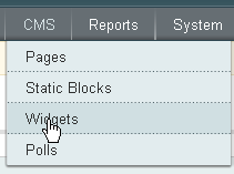 1. Let’s add Special block carousel. Please note that this block/ may not be available in your specific template. Open admin section and go to CMS-Widgets.