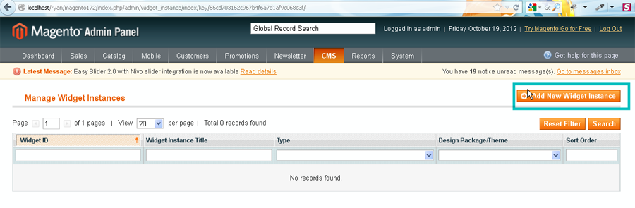 Since widget is not installed we need to add and configure it. Click on Add New Widget Instance.