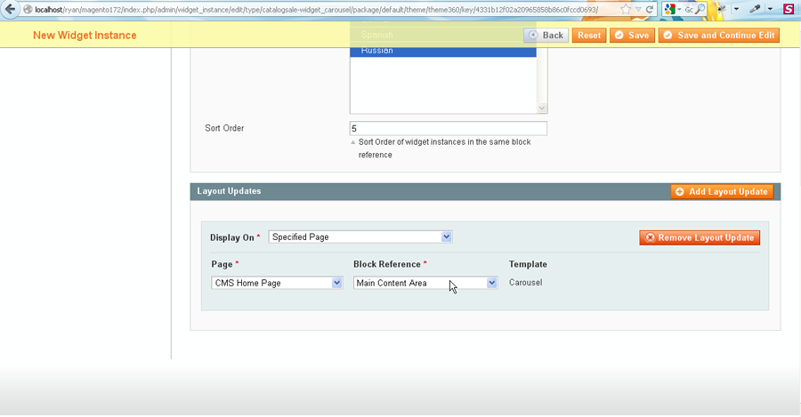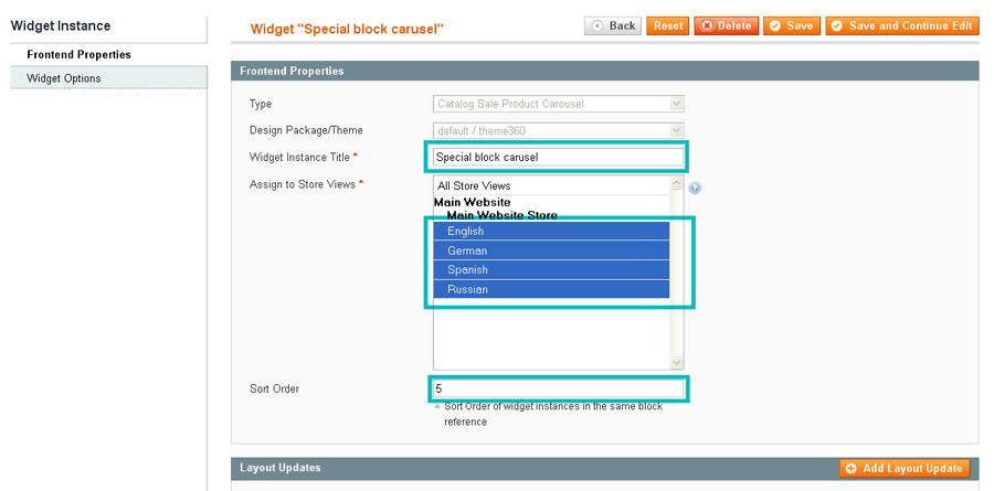 4. Now we need to specify widget instance title, select store views and specify order in which block will appear.