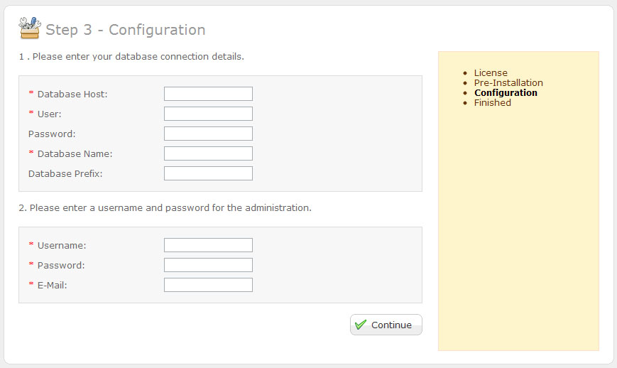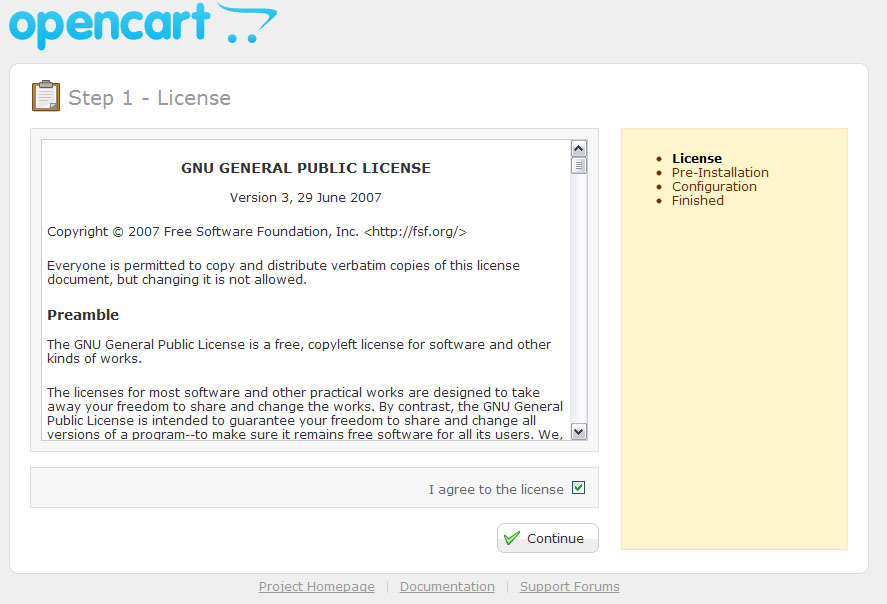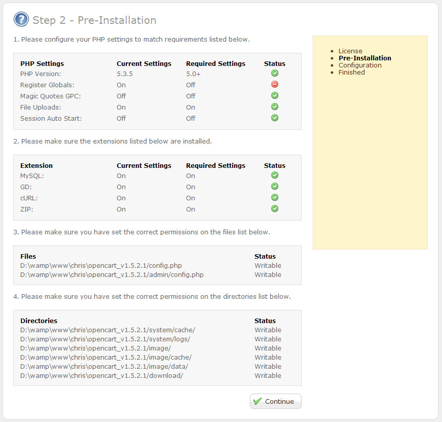 At this step OpenCart checks if your hosting server fits it’s requirements. In case of any issues please contact your hosting provider.