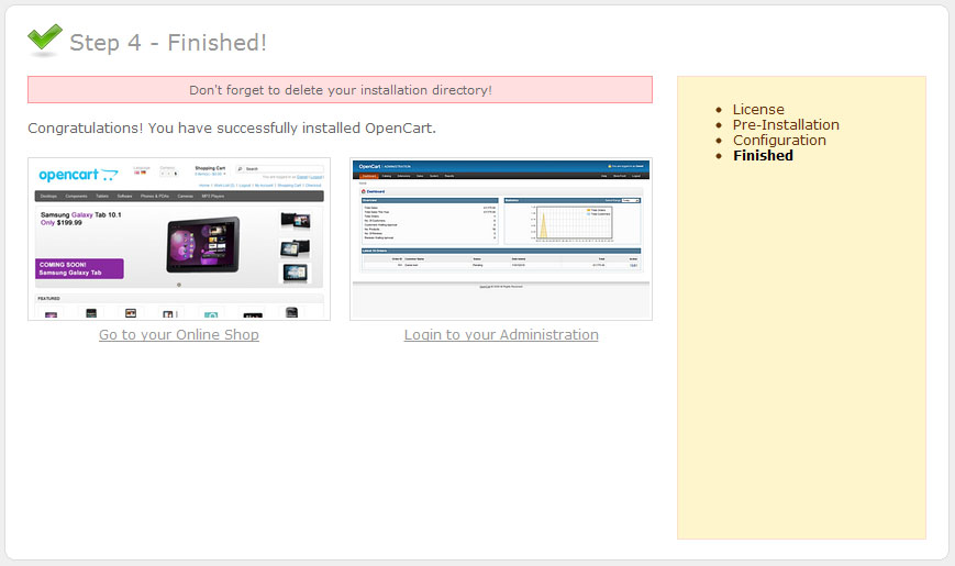 You are almost done. Open the OpenCart installation directory on your server and delete install directory.
