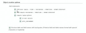 - In Object creation options, check Add DROP TABLE / VIEW / PROCEDURE / FUNCTION / EVENT statement