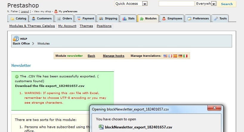 a) Persons who have subscribed using the BlockNewsletter block in the front office. This is a list of e-mail addresses of persons who come to your store that do not become customers, but have subscribed to your newsletter. Using the “Export Newsletter Subscribers” below will generate a .CSV file based on the BlockNewsletter subscribers data.