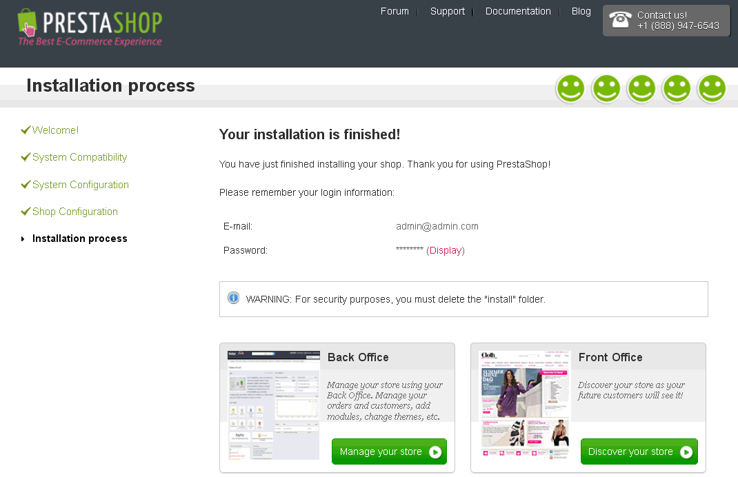 Input the administrator login details. The Prestashop installation is almost complete.