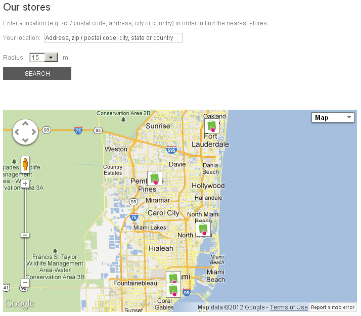 Our Stores page displaying all the stores on the map and allowing to search stores by address, zip, city, state or country.