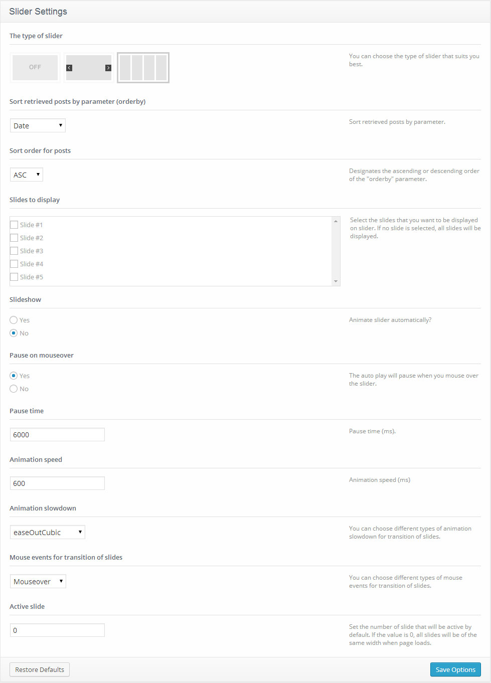 - Active slide - Set the number of slides that will be active by default. If the value is 0, all slides will be of the same width when a page loads.