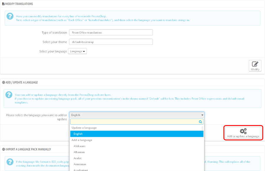 After the multi-language template has been installed, you will be able to add all languages provided with it (English, French, Spanish, German, Russian) to the online store platform. It can be done this way: