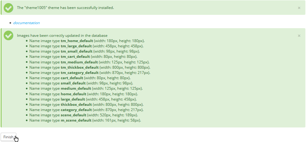 After this you will see the pop-up with the message about successful theme activation: the theme has been installed successfully, images have been re-generated up to the defined in theme dimensions. To finish installation click Finish button.