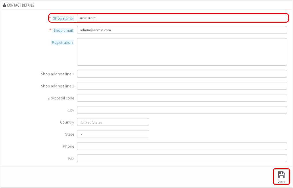 In the Shop name field, type in your store name and click the Save button to save your changes.
