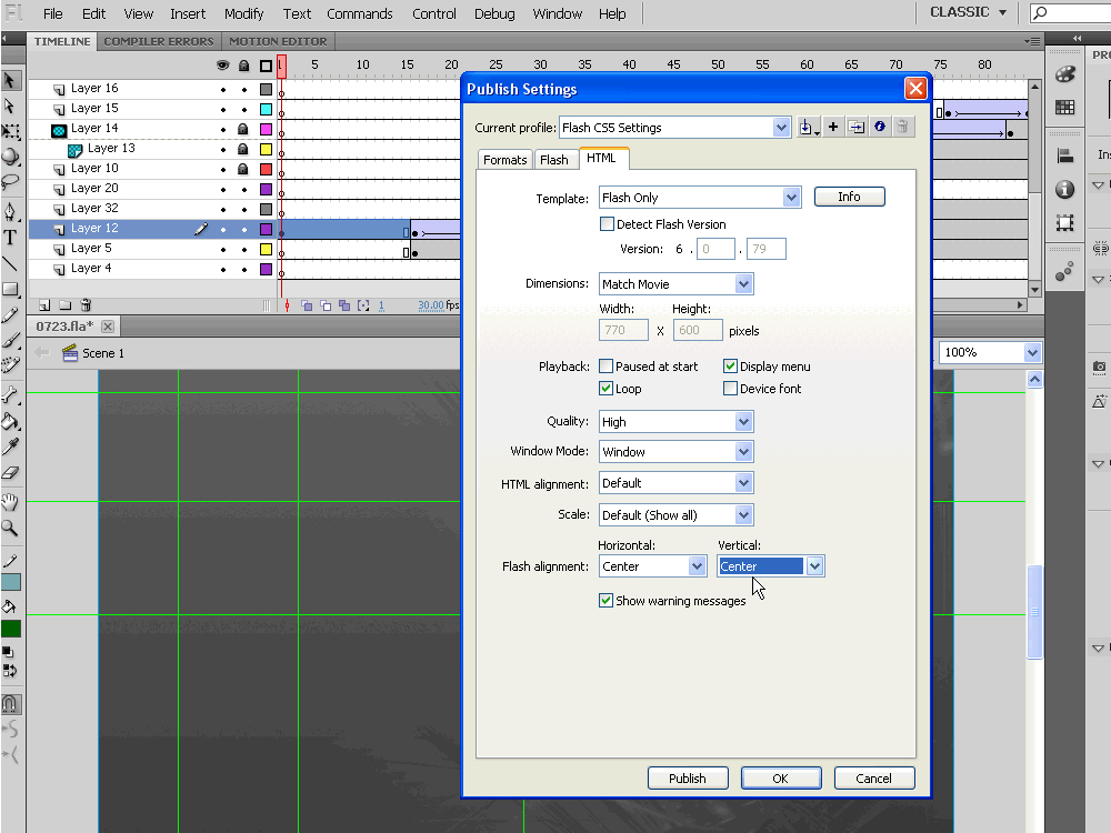 Откройте File -> Publish Settings -> Html