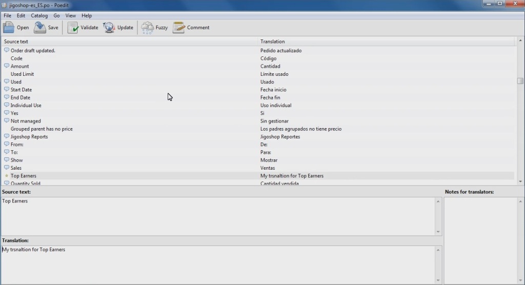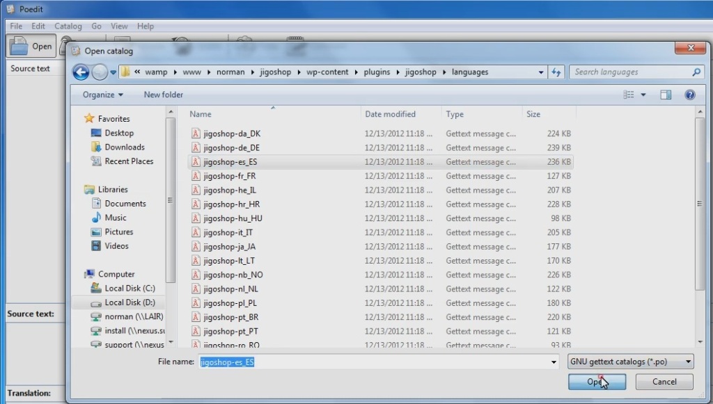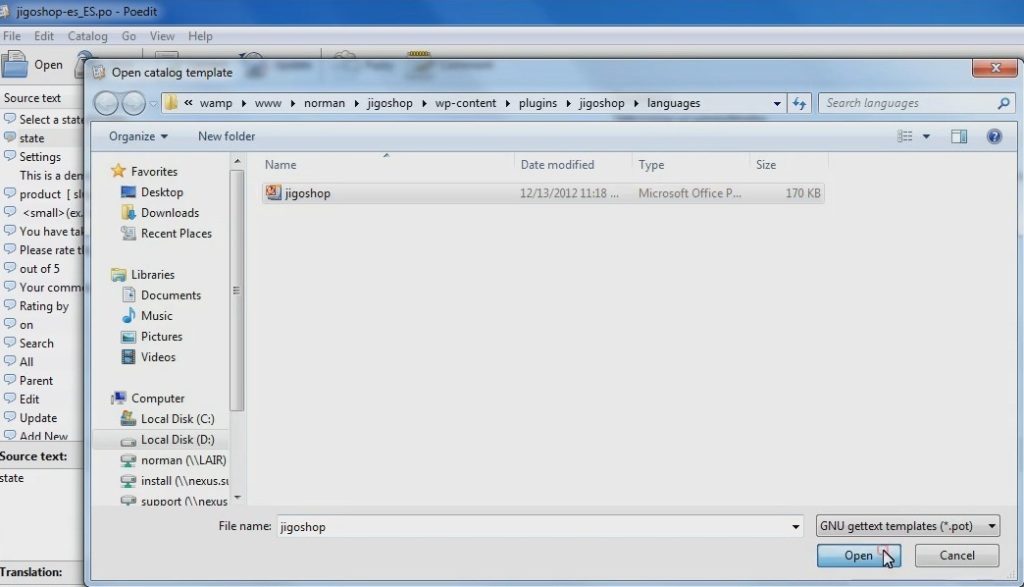 - В меню программы Poedit нажмите кнопку Open (Открыть) и откройте нужный Вам языковой файл из директории wp-content\plugins\jigoshop\languages\ на веб-сервере. Например: jigoshop-es_ES.po