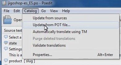 - Если нужный язык отсутствует в папке wp-content\plugins\jigoshop\languages\ , Вы можете создать его в программе Poedit, выбрав файл jigoshop.pot через меню программы File (Файл) > New Catalog from POT (Создать новый каталог из файла .pot).
