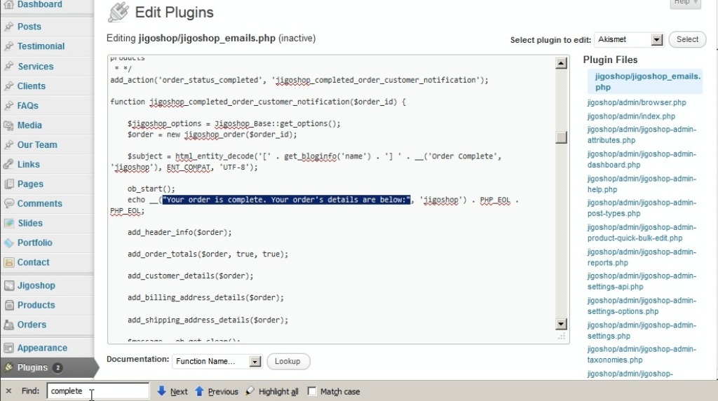 - На следующей странице используйте поисковую утилиту, запускаемую комбинацией клавиш Ctrl + F и найдите значение jigoshop/jigoshop_emails.php.