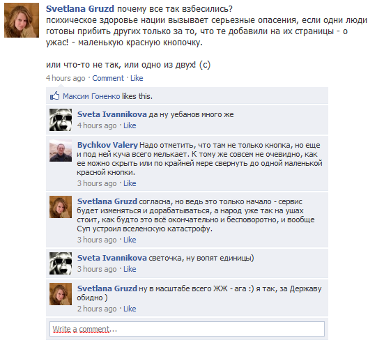 Разумеется, не вынеся столь тяжкого баттхерта, огромное количество впавших в ярость берсерка хомячков тут же набижало на новость в сообществе ru-news и до кучи еще и в пост одного из разработчиков СУПа Ильи Дронова, закидав там всех говном и требованиями немедленно все отключить, сервера залить водой, а недалеких бета-тестеров колесовать на распечатке корпоративной этики. Попутно также выяснилось, что СУПовцев как минимум неоднократно предупреждали (в том числе и тов. Экслер), что делать сервис, который можно отключить только выдернув из розетки шнур питания — идея с весьма туманными перспективами.