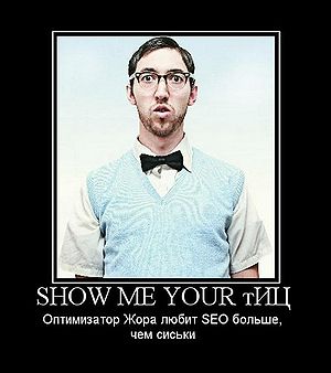 SEO (Search Engine Optimization, маш. поисково-машинная оптимизация, рус. поисковая оптимизация, она же раскрутка сайта, она же продвижение сайта) — эвфемизм для накрутки (вверх) позиции сайта в поисковых системах за счёт несовершенства их алгоритмов и прочей хуиты.