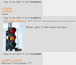 На анонимных имиджбордах временными парадоксами обычно обзывают странные происшествия, глюки или баги движка — например, если сообщение с меньшим номером оказывается датированным позднее, чем сообщение с бо́льшим номером.