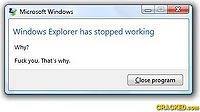 Довольно-таки куцый файл-менеджер и одновременно системный процесс в виндах, который даёт юзеру доступ ко всем директориям и файлам, заботливо хранящимся на винчестере. Если его убить, то добраться до своих файлов ты не сможешь. Приложение настолько примитивно, что в системах версий от трёх и младше, существовал отдельный File Manager (у экзешника было доставляющее имя Файлман). После срача с Оперой (см. выше), файлман был быстренько выпилен, а Explorer и Internet Explorer стали единым целым — таким образом Гейтс хотел показать, что без встроенного интернет-браузера винде никак не возможно. Но ушлые дяденьки из антимонопольного комитета слушать его не захотели и анально принудили раскукожить всё обратно. Впрочем, до сих пор можно открыть любую папку, в адресной строке набрать интернет-адрес, и о чудо — мы в интернетах!